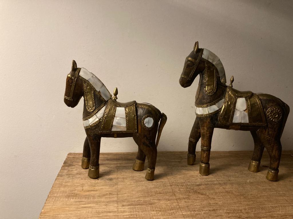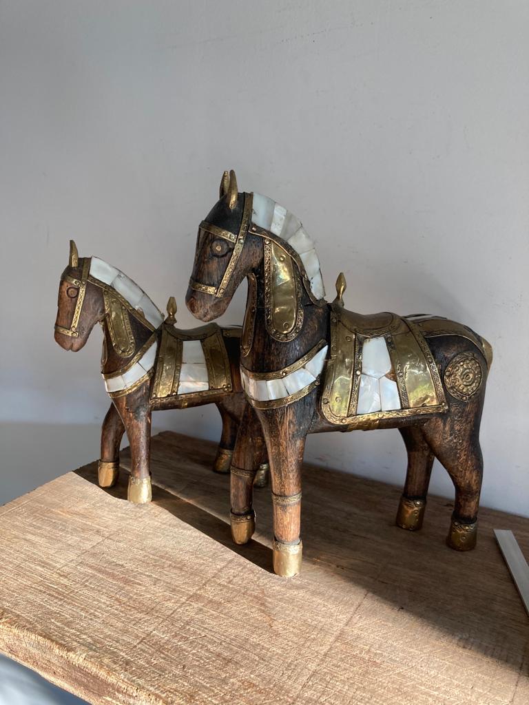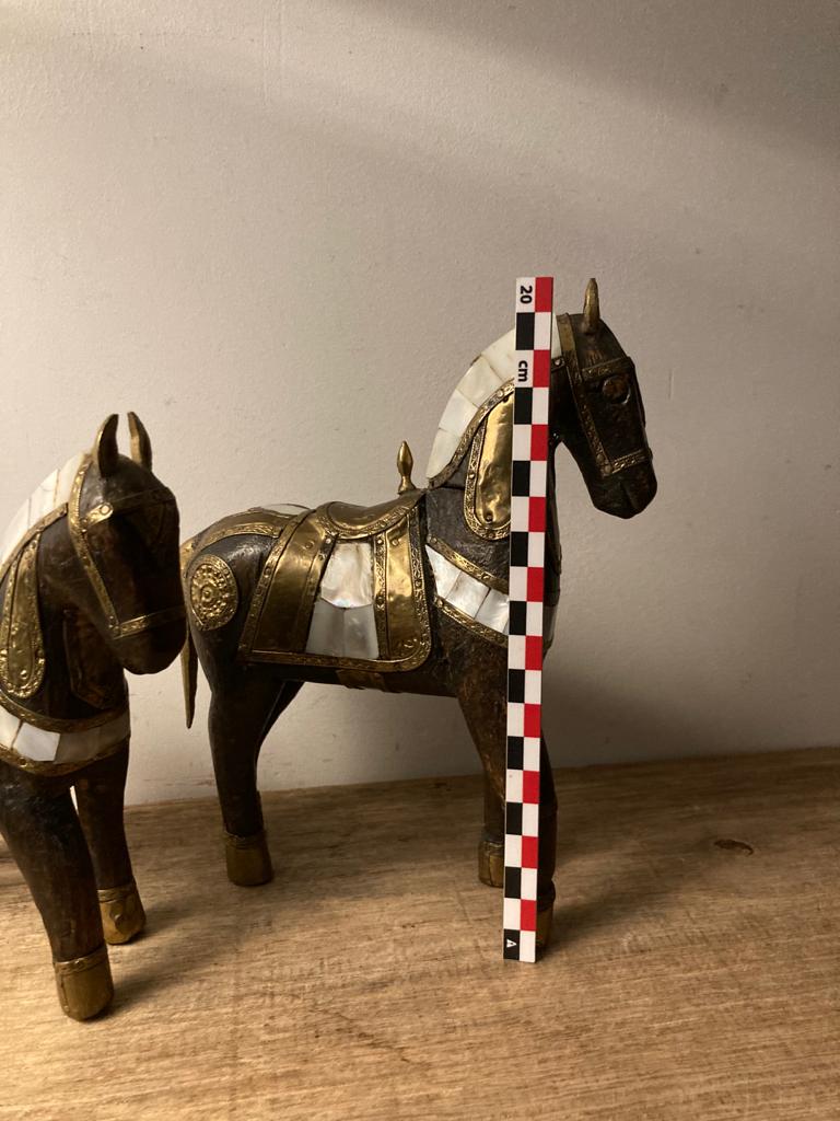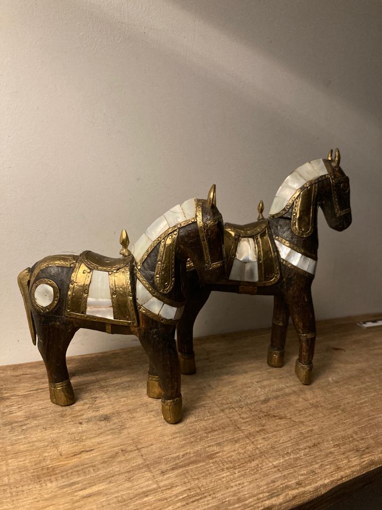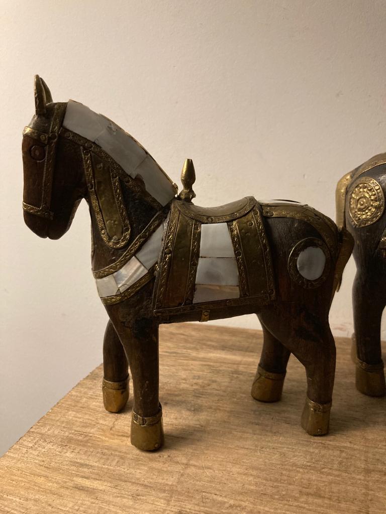 Verkocht ! 2 Antieke houtsnijwerk paarden, afgewerkt met koper en ingelegd met parelmoer